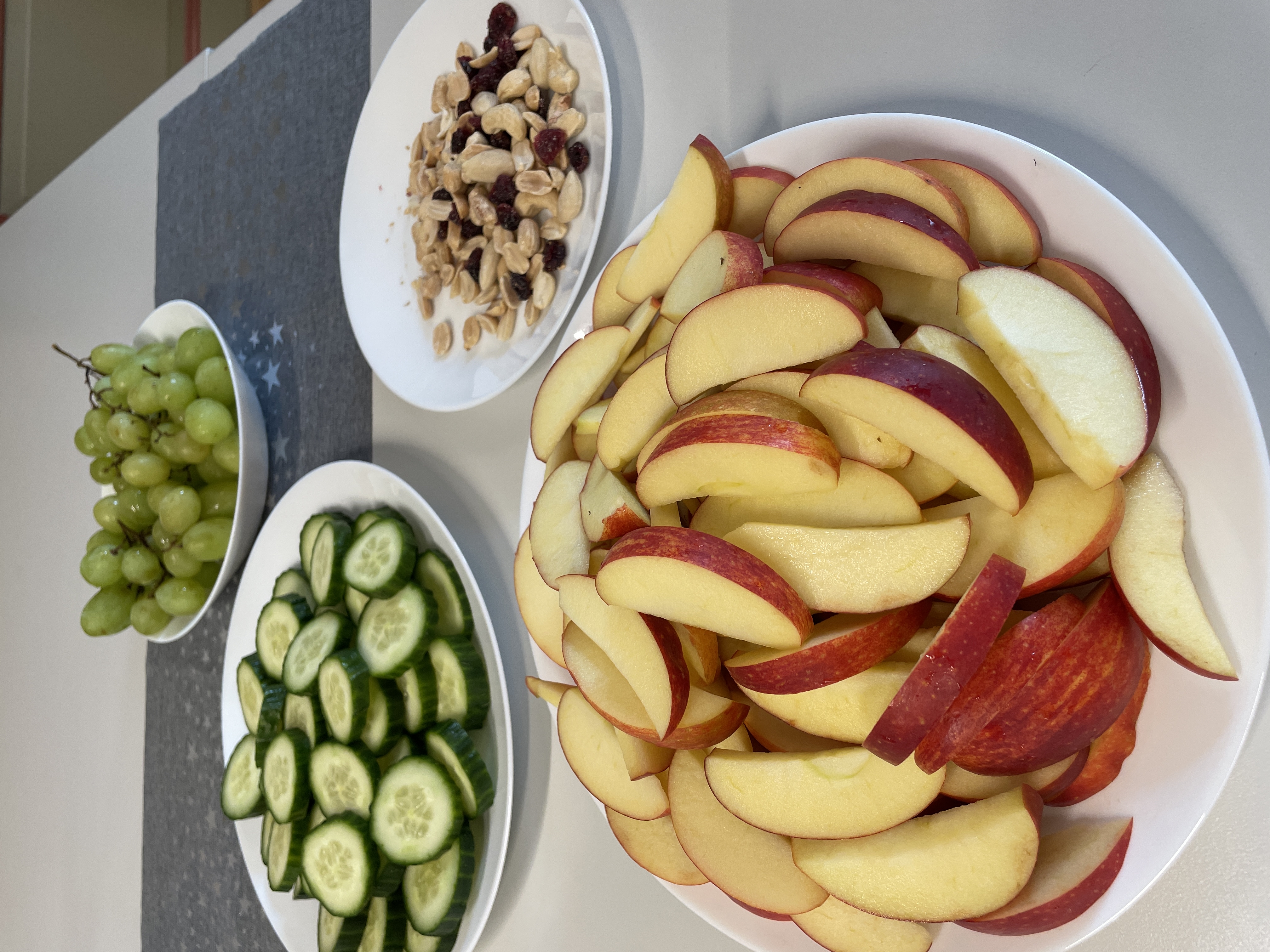 Für den Nachmittagssnack schneiden die Kinder Obst und Gemüse. Es stehen Getränke zur Verfügung.
